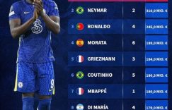 直播吧7月1日讯 卢卡库在不久前官宣租借回归国米,800万欧租借费也让他本就居首的历史转会费总额继续提升,《转会市场》也列出了足坛历史转会费榜单。